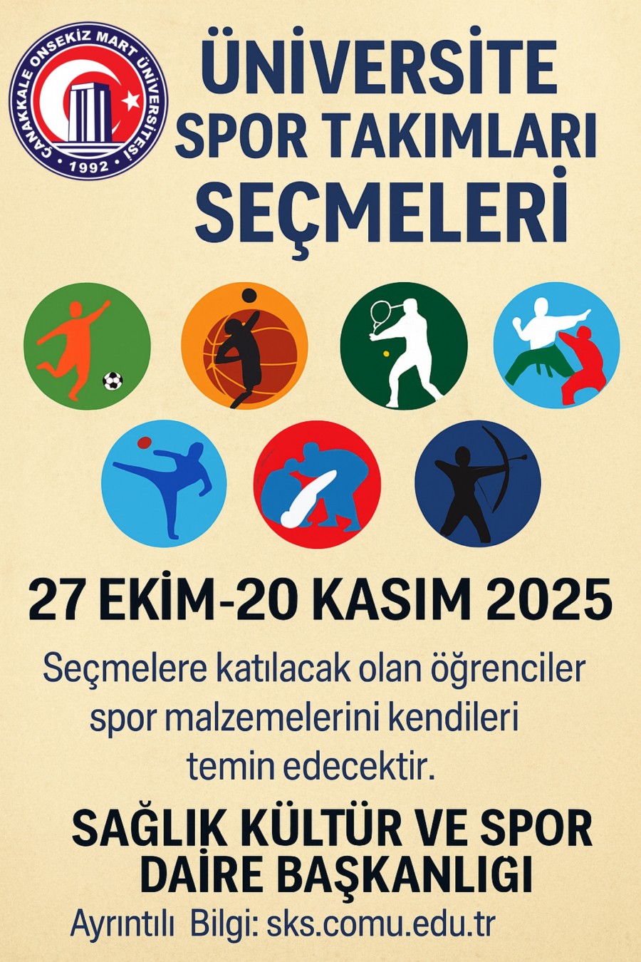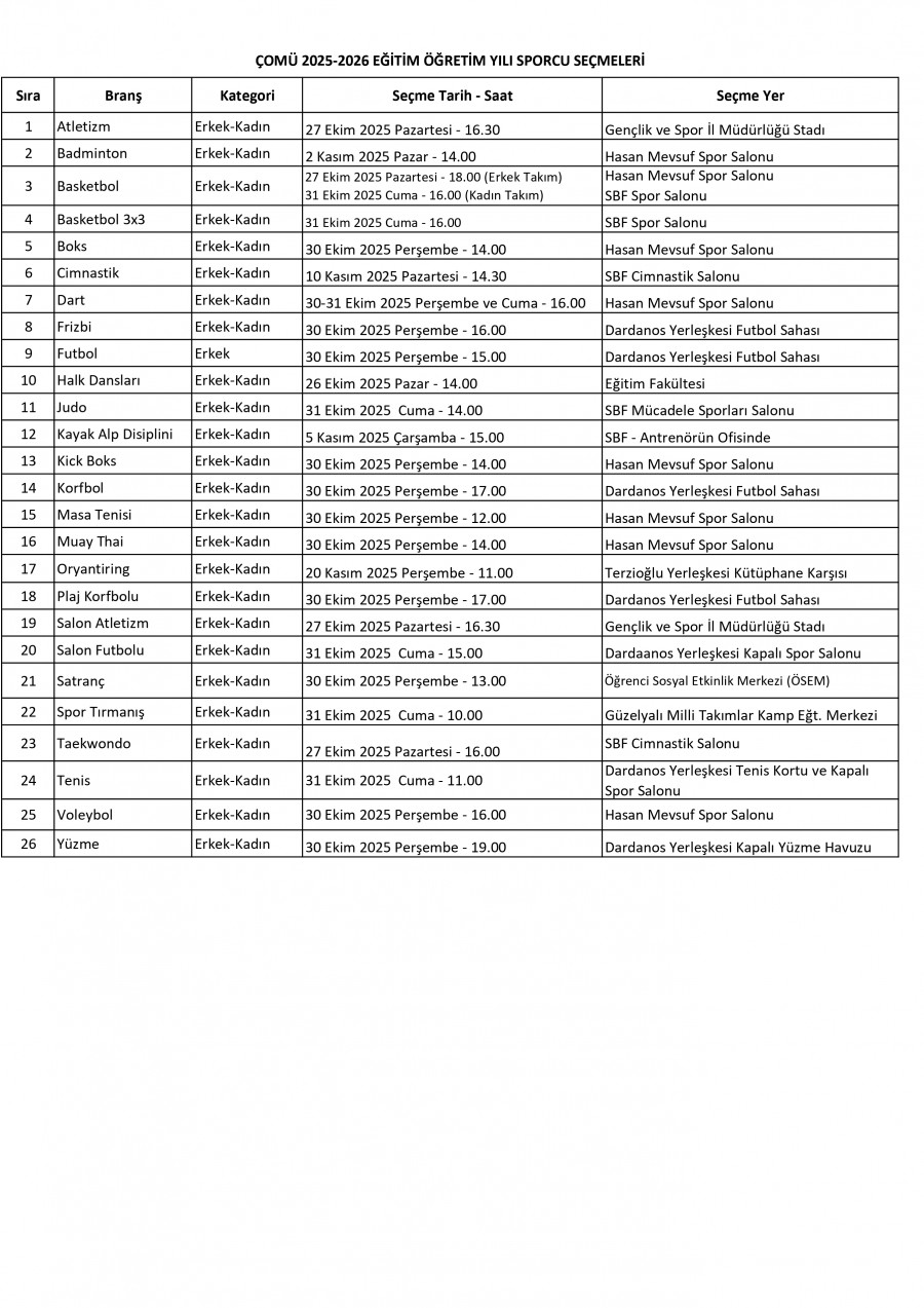 Türkiye Üniversite Sporları Federasyonu tarafından 2025-2026 eğitim-öğretim yılında düzenlenecek yurt içi ve yurt dışı organizasyonlar ile düzenlenecek diğer spor etkinliklerinde Üniversitemizi temsil edecek spor takımlarının oluşturulması için çalıştırıcılar tarafından sporcu seçmeleri aşağıda belirtilen programa göre yapılacaktır.